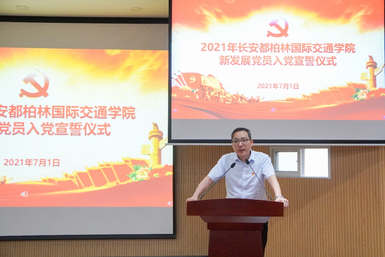 于鸿远教学楼五楼报告厅举行2021年新发展党员入党宣誓仪式。学院党总支副书记、副院长姚以亮,副院长柏强,全体教职工党员和学生党员参加仪式。