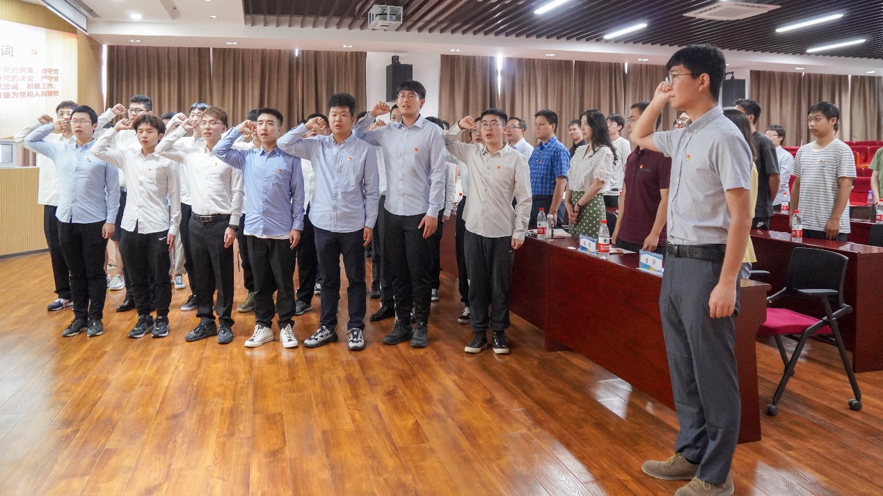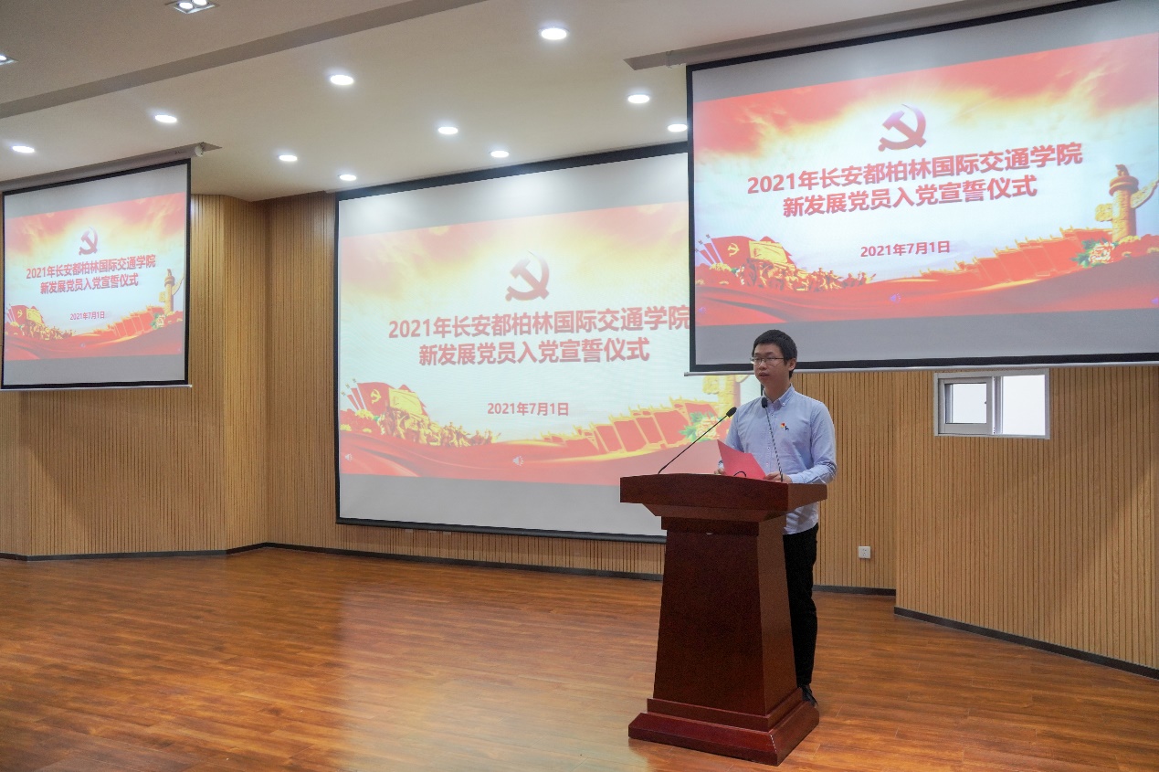 仪式上,学院教职工党员为21名新发展党员佩戴党员徽章。之后,学生党支部书记孙士强带领新发展党员进行入党宣誓。