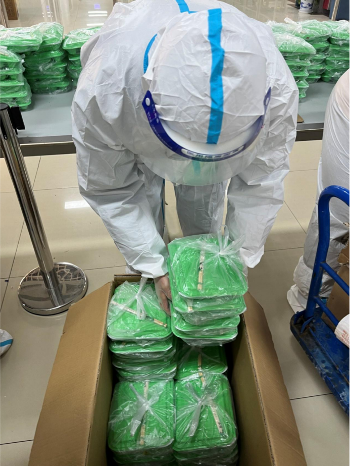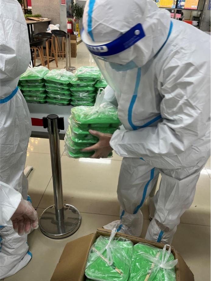 叶靖辉:我们负责整个20号楼的送餐工作,依次将1000多份早餐、午餐、晚餐从食堂运到20号楼。