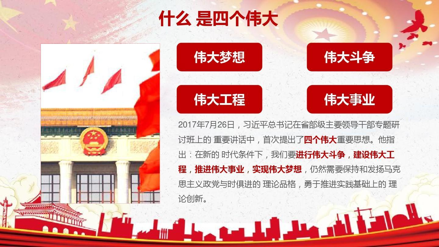 伟大斗争,伟大工程,伟大事业,伟大梦想,紧密联系、相互贯通、相互作用,其中起决定性作用的是党的建设新的伟大工程。(摘自习近平在中国共产党第十九次全国代表大会上的报告,2017年10月18日)