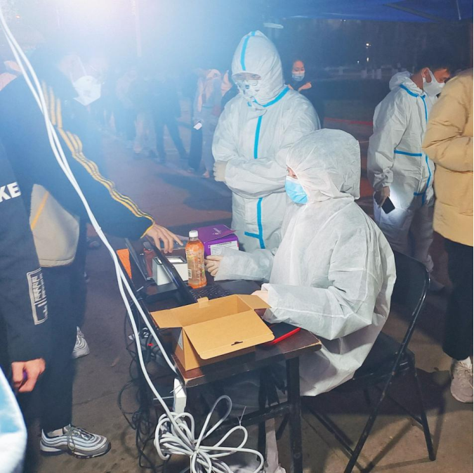 夜晚,他们依然坚守岗位,在核酸采集点维持秩序,协助医生完成采集工作
