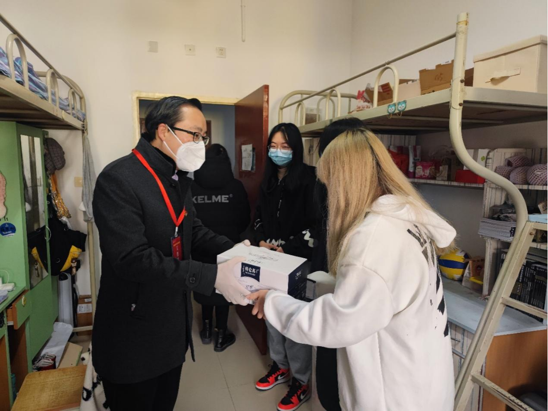 活动最后,学院领导老师为同学们送上了暖水壶、牛奶、火腿肠、方便面等生活物资,为大家送上了亲切的节日祝福,祝愿大家在新的一年里,砥砺奋进,不负韶华!希望通过大家的共同努力,早日拨云见日,迎来抗疫胜利的曙光!
