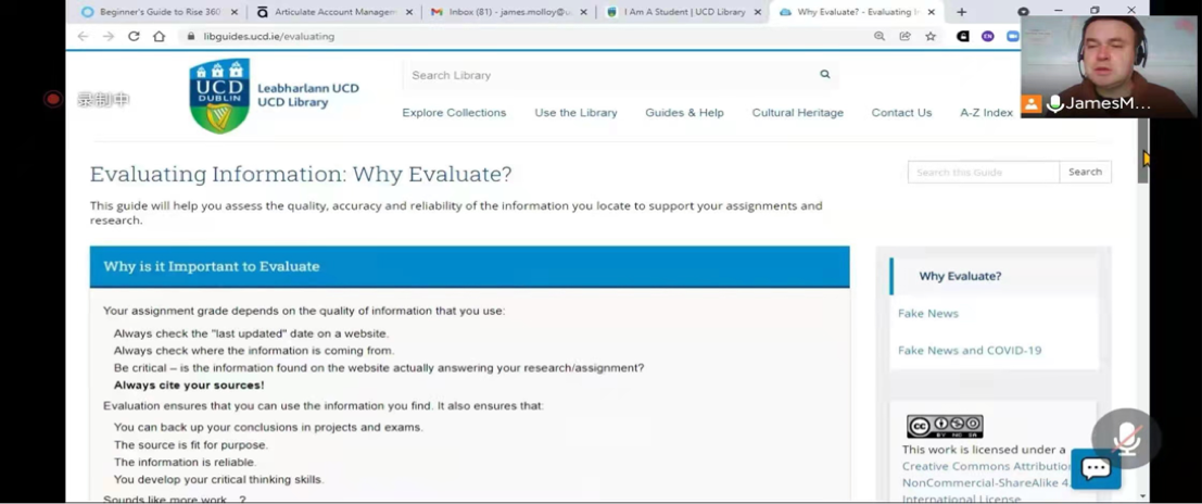 随后,James Molloy老师通过屏幕共享对图书馆系统的各项功能进行了详细介绍,期间James Molloy老师多次强调 Academic Integrity(学术诚信)和Critical Thinking(批判性思维)的重要性, 同学们认真学习试用系统的同时并积极提问。
