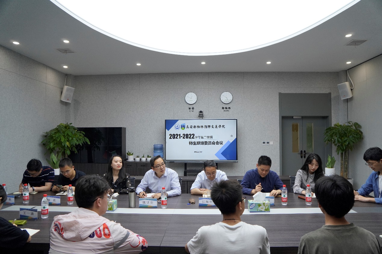 在鸿远教学楼四楼会议室召开2021-2022学年第二学期师生联络委员会会议。学院党总支书记、院长汪海年,党总支副书记、副院长姚以亮,副院长柏强,学院综合办公室、教学教务部和学生事务部主要负责人,各年级学生代表20余人参加了本次会议。会议由学生事务部副主任孙士强主持。