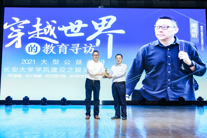 讲座开始前副校长赵祥模代表学校接受新东方教育科技集团准备的赠书《穿越世界的教育寻访》。