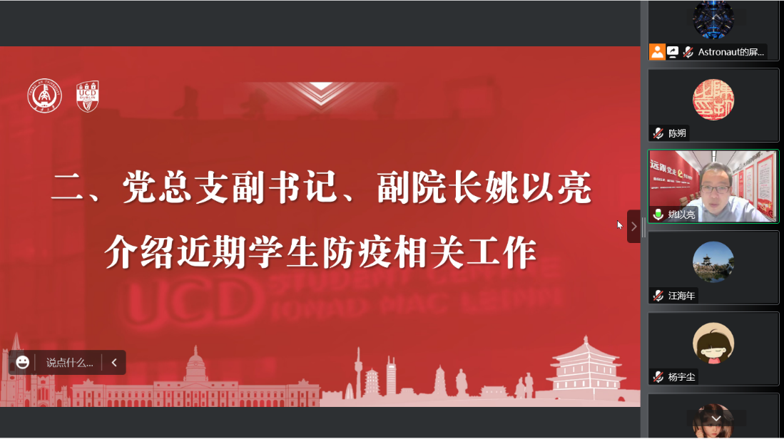 学院党总支副书记、副院长姚以亮介绍近期学生防疫相关工作,并提出具体要求。他强调,全院师生要认清形势、提高站位,做好思想准备,坚决扛起疫情防控的政治责任;要毫不松懈、慎终如始,汇聚全体师生的力量,牢牢守住校园疫情防控底线;要夯实责任、联防联控,确保各项防控措施落细落实落到位;要善于作为、关心学生,强化使命担当,严格问责机制,杜绝在疫情防控中出现形式主义和官僚作风。