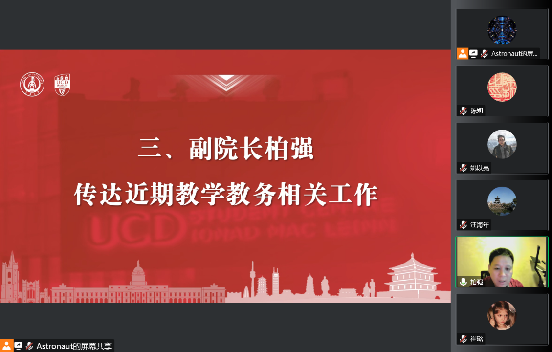 学院副院长柏强传达教学教务相关工作。他对近期教学教务和国际交流工作开展情况进行介绍,并对线上线下教学切换和保障,学生国际交流能力提升培训等工作进行安排部署。