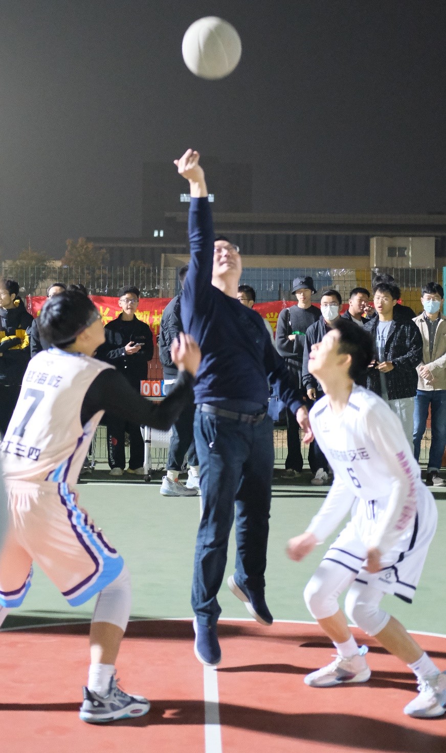 为深入了解校园封闭管理期间同学们的学习生活状况,汪海年、姚以亮、各年级辅导员到学院“新生杯”篮球赛现场和同学们一起观赛,汪海年为比赛开球。