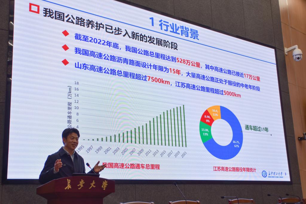 于新教授以“长寿命目标的既有路面结构延寿技术之思考”为题,结合行业背景和个人研究,详细介绍了既有路面结构延寿这一我国当前面临的关键工程问题的核心技术、解决方案和研究方向。他谈到,既有路面结构延寿是国家和行业的战略需求,而长寿命目标的既有路面结构延寿还面临诸多理论和技术难题,在检测评价技术创新、设计理论与方法突破、专用结构与材料研发等方面,亟待行业的共同努力。于新教授言辞质朴易懂、亲切诙谐,从实际问题的解决中引导同学们培养科研思维、学习科研方法,激励同学们投身于我国建设“交通强国”的伟大实践中,贡献自己青春力量。