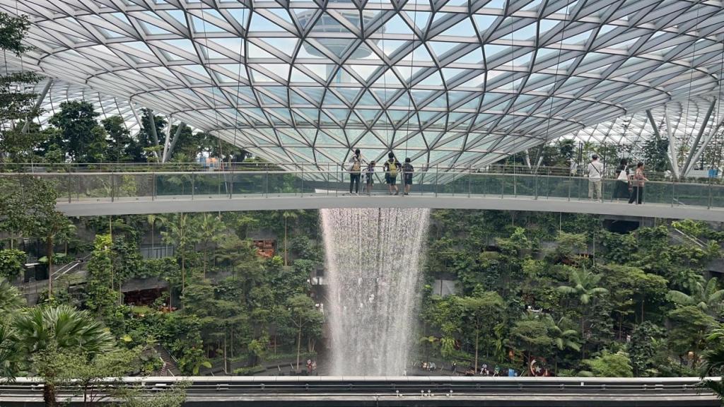 抵达机场后,研学团体验了有“全球最美机场”之称的“星耀樟宜”。“星耀樟宜”坐落于新加坡樟宜机场榜首航站楼前方,也是机场的中心方位,项目是一座集合航空设备、购物休闲、住宿餐饮、景观花园等多功能于一体的综合性建筑。这座世界最高的室内瀑布,无疑是“星耀樟宜”的一大亮点。人在室内就可以感受到瀑布的壮观景象,有一种身处大自然的新鲜感。目击高达40米的“雨漩涡”从7层高的穹顶上倾泻而下,同学们无不感叹项目设计者的异思妙想,大家纷纷拍照留念,定格美好的瞬间。