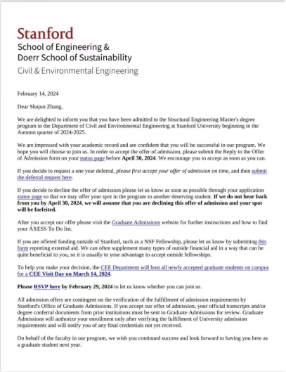 张舒峻获美国斯坦福大学硕士录取通知书