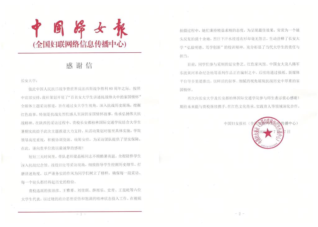 组建“八秩回响寻烽火・青春誓言述初心”暑期社会实践队,积极参与中国妇女报社(全国妇联网络信息传播中心)发起的“百名女大学生讲述抗战烽火中的家国情怀”主题报道活动,赴陕西延安、韩城等地开展实地采访,沉浸式感悟烽火岁月的家国大义,录制系列视频讲述抗战故事,传递家国情怀,让红色记忆在青春视角下焕发时代光彩。4名学生的参访感悟分别在中国妇女报2025年8月19日、8月28日的头版要闻和9月4日“纪念中国人民抗日战争暨世界反法西斯战争胜利80周年”特刊刊出,讲述抗战故事的视频在中国妇女报客户端、中华全国妇女联合会官方公众平台、陕西省妇女联合会官方公众平台、学习强国、新浪网、网易网等多家媒体平台发布。