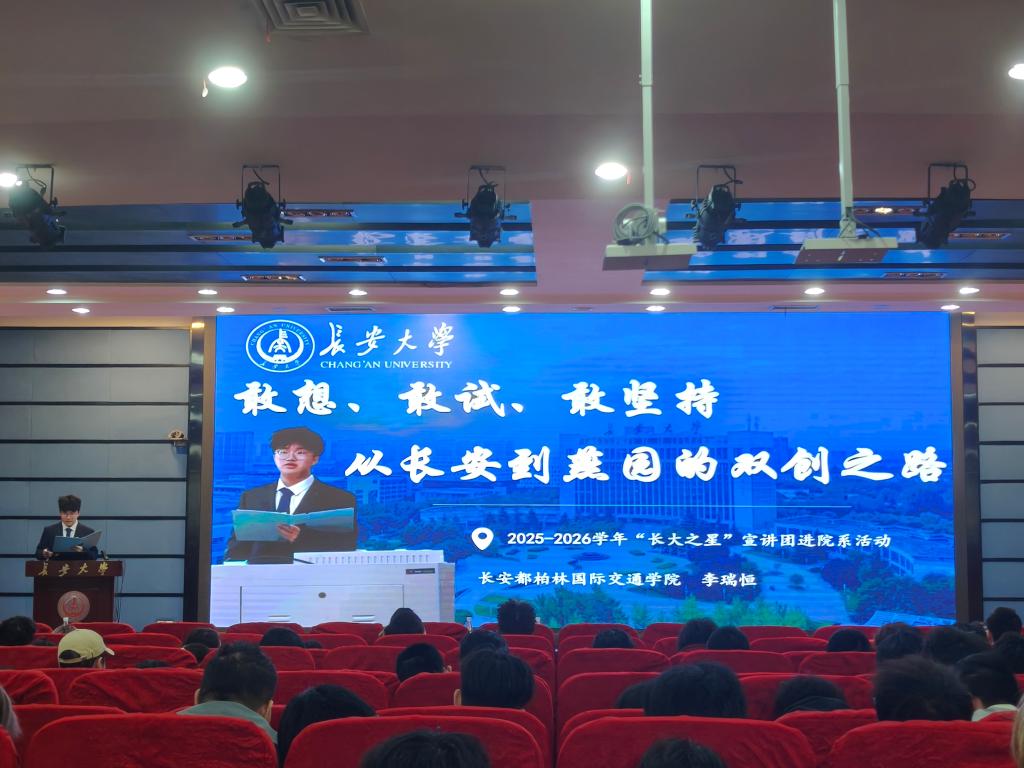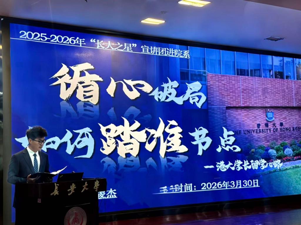 为充分发挥朋辈榜样示范引领作用,营造奋发向上的优良院风学风,3月30日,学院举办“长大之星”宣讲团进院系活动暨“朋辈论坛”第二十六讲。2025级全体本科生、辅导员张力雄、惠亦嘉参加宣讲会。活动由张力雄主持。