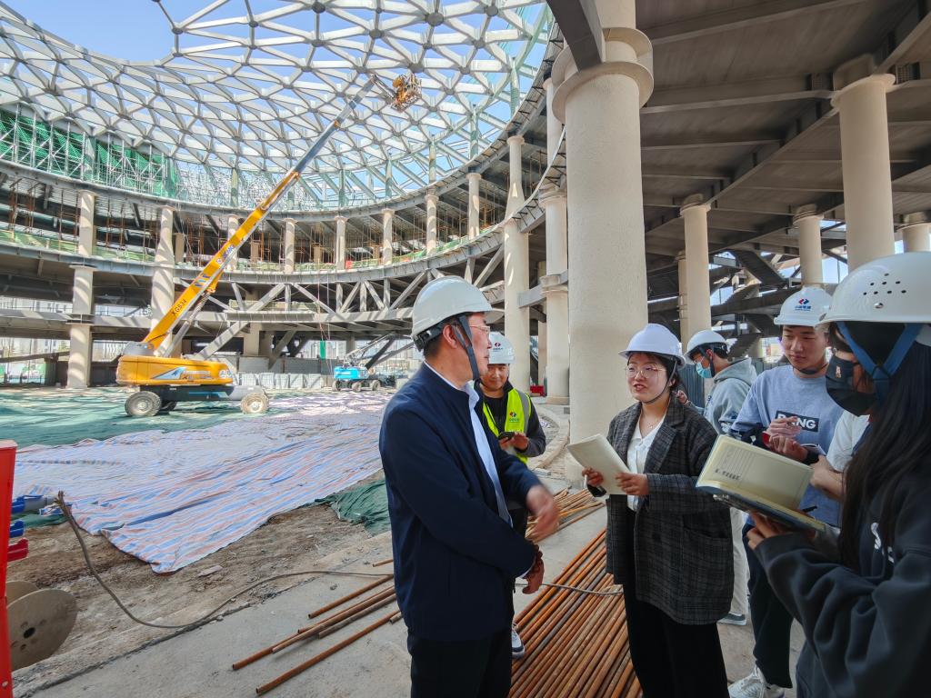 在与工作人员的交流互动中,同学们了解到现代化的提升设备使该项目标志性的玻璃穹顶得以实现,无人机航拍和实时监测技术守护着施工现场的环境安全等,团队学生切实体会到了现代化科技为传统行业注入发展动能,也为复杂的城市管理提供了强大的技术支持。
