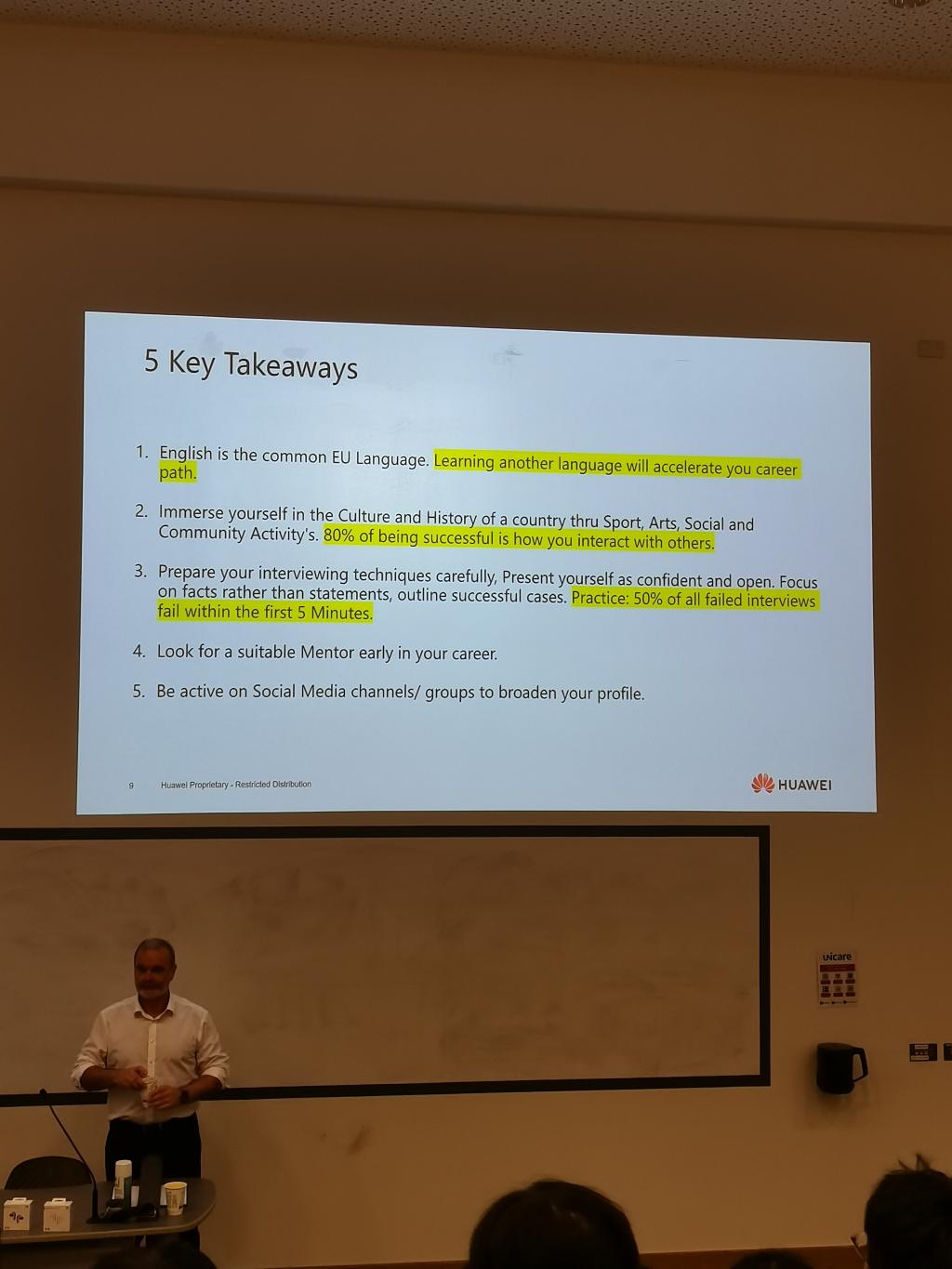 此外,同样令人感到惊喜的还有华为爱尔兰副总裁—David Kenny的到来。David概述了华为2004年进入爱尔兰以来的发展历程及华为爱尔兰分公司下一阶段的发展计划。David还介绍了在爱尔兰和欧盟运营科技公司面临的挑战,分享了他的职业生涯经历并结合自身经历给大家提出了宝贵建议。讲座结束后,学院2023级车辆工程专业周至淳同学对David的耐心讲解与切身建议表达了由衷感谢。