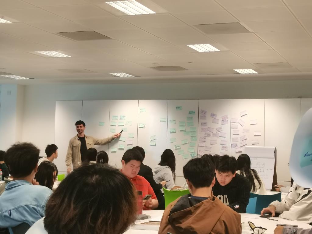 课堂上,同学们围绕“怎样减少污染”、“如何使大学生更好的学习”和“如何帮助国际留学生们相互建立友谊”三个课题进行了交流讨论。同学们集思广益,从不同的角度思考分析问题,积极互动提问,用“design thinking”方法更好地解决了问题,得到了授课老师的表扬和鼓励。
