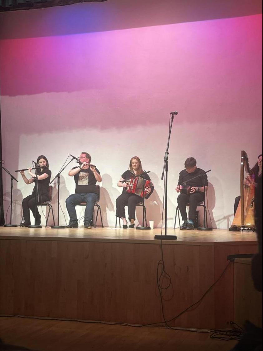 8月1日,参营学生们欣赏了爱尔兰传统民族乐器和踢踏舞。爱尔兰音乐通常采用4/4拍和3/4拍,速度适中,常使用渐变速度,使得情感表达更加细腻。爱尔兰踢踏舞风格自由开放,重视节奏和技巧。表演中间还穿插了自由跳舞环节,参营学生们两两组队,和台上的演奏家和舞者们度过了一个美好的夜晚。