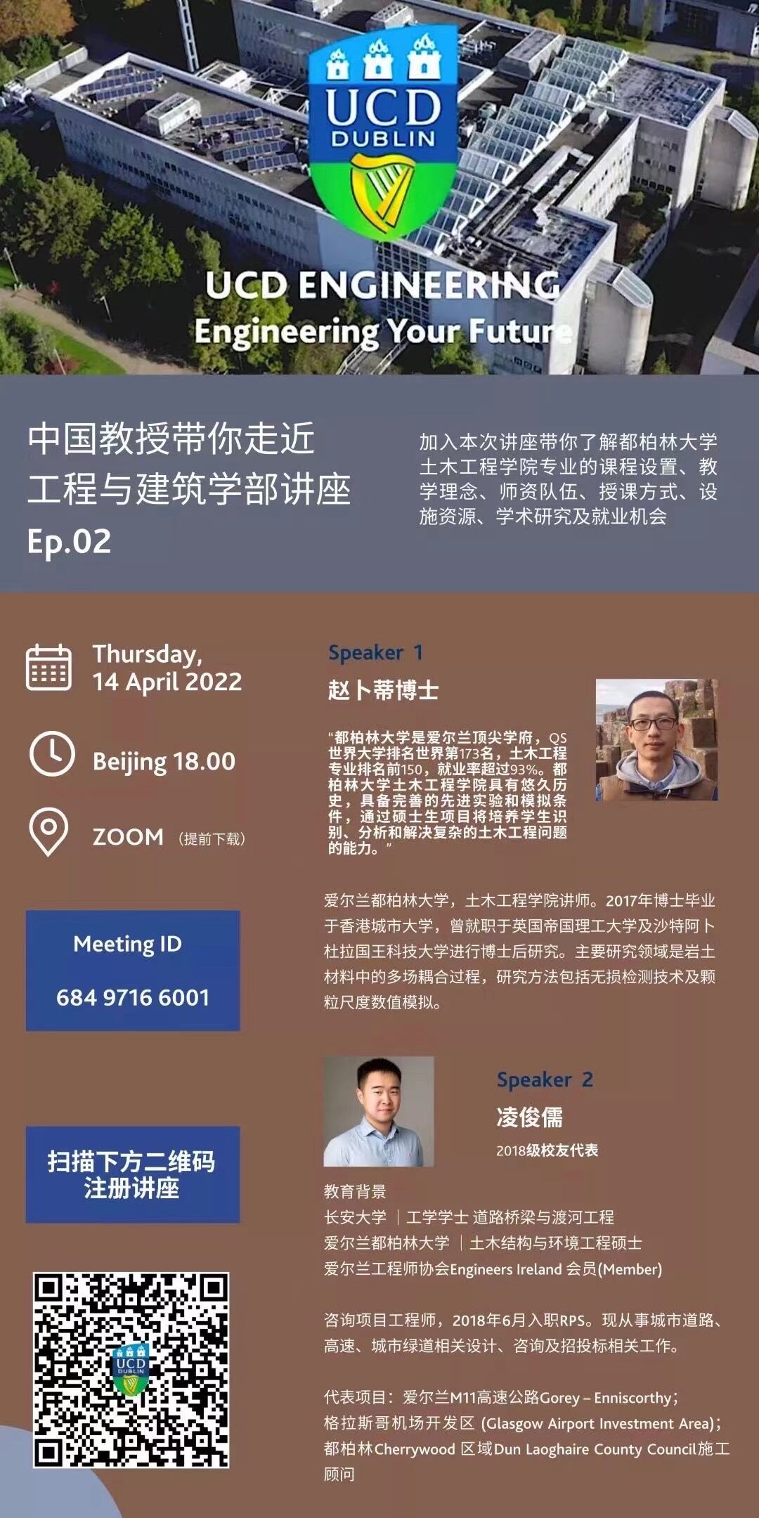 国际交流 主页 - 国际交流 - 正文 关于举办爱尔兰雷火电竞 工程与建筑学部讲座的通知 浏览量:时间:2022-04-13 4月14日(星期四)下午6点,UCD将举办线上讲座,邀请土木工程学院讲师赵卜蒂博士及2018级校友代表凌俊儒为主讲嘉宾,介绍爱尔兰雷火电竞 土木工程学院专业的课程设置、教学理念、师资队伍、授课方式、设施资源、学术研究及就业机会。 ZOOM 会议链接:68497166001