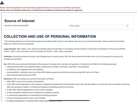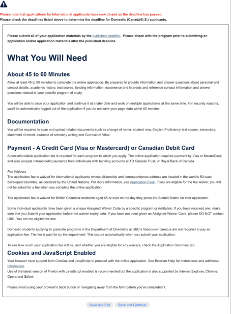 接下来是申请填写前的注意事项,填写的时间大概是45-60分钟,同学们要拿出来相应的时间来专心填写,申请UBC要求同学们提交自己的雅思等考试的成绩单,并且使用支持双币&国际汇款的银行卡来交费等: