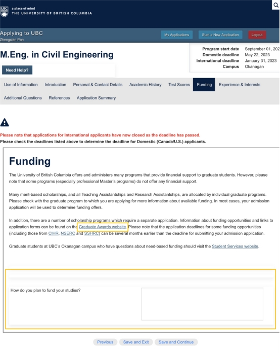 接下来填写你打算如何为学业提供资金支持(How do you plan to fund your study?),UBC的部分研究生项目会提供一定的补助,就可以在这里申请: