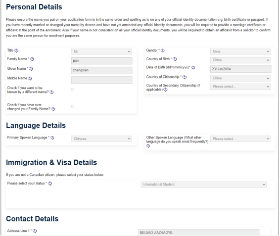 首先是personal details(个人基本信息)如:姓名、出生日期、国籍、居住地等;在immigration and visa details一栏填写international student(国际学生);