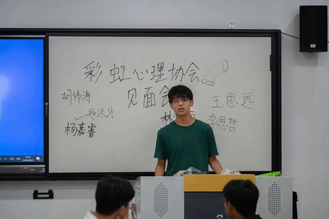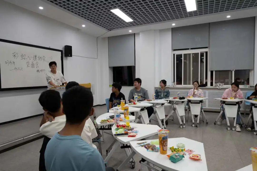 面试纳新环节结束之后,彩虹心理协会全体成员于9月22日晚在鸿远教学楼1402教室举行见面会,会议由实践部部长胡伟涛主持。
