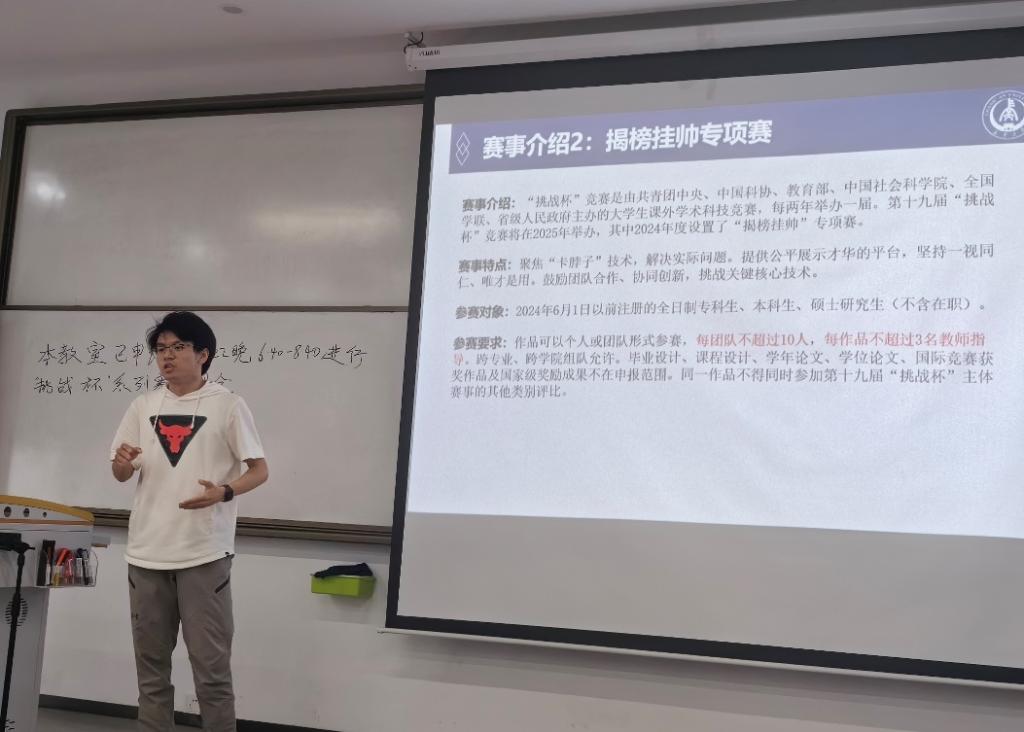 曹胡杨为同学们结合学院情况讲解了创新创业及学科竞赛赛事框架、论文类别和级别、专利和成果应用证明等内容,并强调了“挑战杯”系列赛事的赛事级别、范围和重要性。他表示,参加竞赛需要关注项目本身,要持续做好项目推进和研发,最终转化成论文、专利和竞赛获奖等成果,希望同学们能理清竞赛思路,抓住参赛机会,做好参赛准备,打磨参赛作品,最终有所收获。