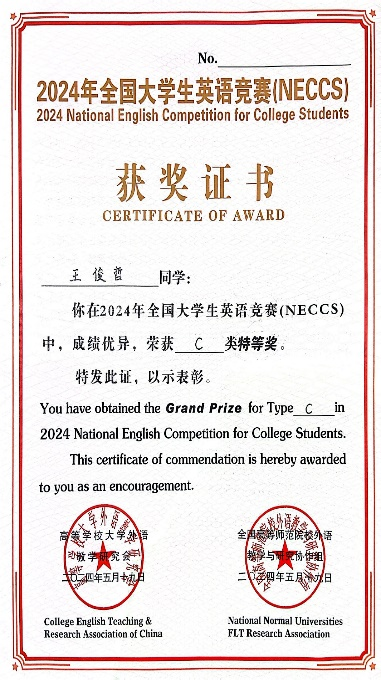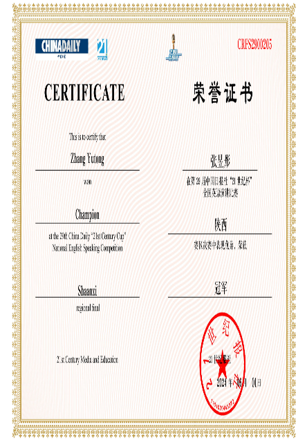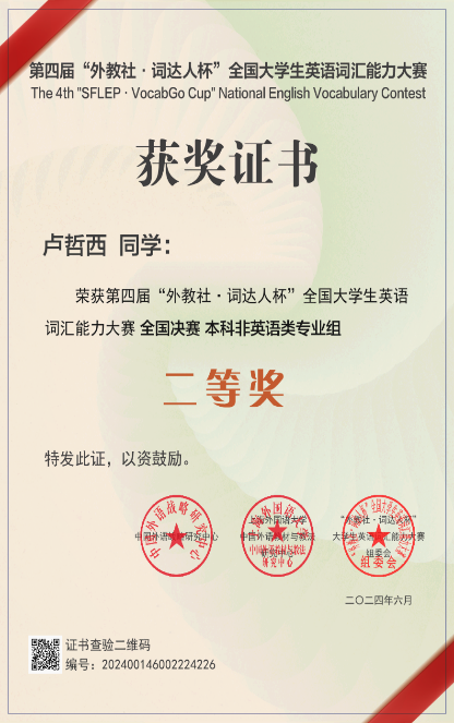在上半年举办的各项英语综合能力竞赛中,长安都柏林国际交学院学生荣获多项奖项。其中,“外教社·词达人杯”全国大学生英语词汇能力大赛国家二等奖1项,全国大学生英语竞赛(NCESS)特等奖1项、一等奖3项、二等奖25项、三等奖34项,“21世纪杯”全国英语演讲比赛陕西省冠军1项等。