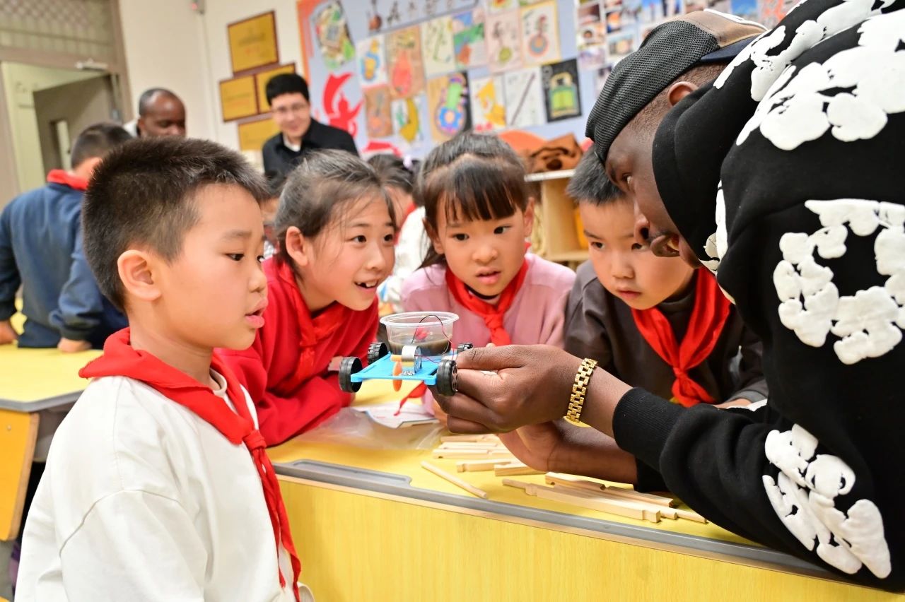 在“动手实践”环节,全体中外学生志愿者通过电解反应原理,指导小朋友们完成盐水动力车制作,镁片与碳片在盐水中产生电流驱动小车运行,生动展现绿色能源奥秘。国际学生志愿者带领孩子们运用榫卯结构搭建鲁班桥模型,通过“榫接卯合”体验古代工匠智慧。实践活动受到全体小朋友们的喜爱。活动现场中外学生志愿者共同协作,有效激发了青少年对工程技术的探索热情。