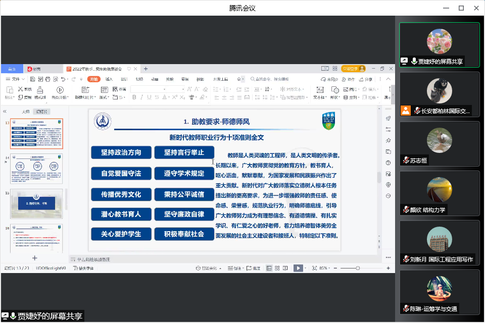 教学教务部主任贾婕妤主持,10位课程负责人以及12名研究生助教参加了本次线上会议。
