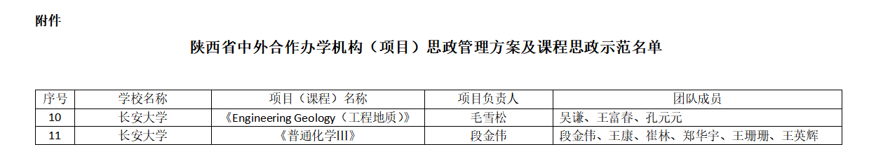 组织申报的两项校级本科课程思政示范课程建设项目(中外合作办学专业课程)被评为陕西省中外合作办学优秀课程思政示范项目。两项项目分别是,2021年校级第二批本科课程思政示范课程建设项目立项的中外合作办学课程《普通化学III》,和2022年校级第三批本科课程思政示范课程建设项目立项的中外合作办学课程《Engineering Geology(工程地质)》。
