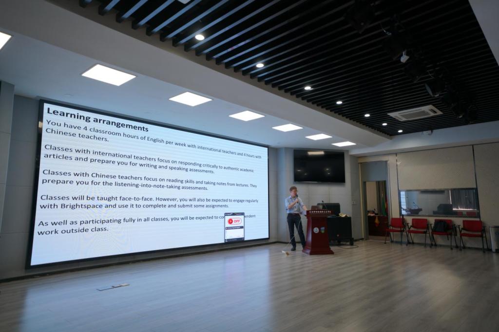 会上,Alex Runchman和Stephen Kelly针对大二年级英语课程的不同培养目标和学习目标进行了讲解与介绍,并组织与学生互动了解学生对英语课程的疑问和建议。他表示,大家应将英语学习目标由能力培养逐渐调整到学术导向,任课教师将把培养方向调整为提升学生的学术文章写作能力等,为大三大四开设的雷火电竞
